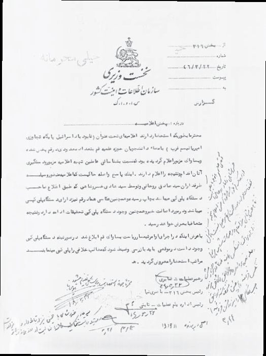 محترما به طوری که استحضار دارند اعلامیهای تحت عنوان (نابود باد اسرائیل پایگاه تجاوزی امپریالیسم غرب) به امضای دانشجویان حوزه علمیه قم به تعداد معدودی در قم پخش شده و به ساواک مزبور و دستگیری آنان اقدام و نتیجه را اعلام دارند. اینک پاسخ واصله حاکیست که اعلامیه منظور وسیله طرفداران سیدصادق روحانی و توسط سیدهادی خسروشاهی که طبق اطلاع صاحب دستگاه پلیکپی میباشد به چاپ رسیده و همچنین عکاسی هما در قم نیز دارای دستگاه پلیکپی میباشد و در مورد اصالت خبر و همچنین وجود دستگاه پلیکپی تحقیات ادامه دارد و نتیجه متعاقباً به عرض خواهد رسید.