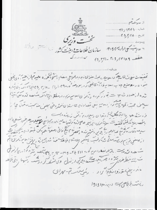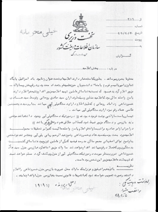 • آقای صابری با توجه به اینکه خسروشاهی داماد روحانی است از ساواک قم خواسته شود که ضمن اعلام نتیجه تحقیقات معموله در مورد صحت و سقم موضوع نسبت به کنترل دقیق خسروشاهی نیز اقدام و در صورت مشاهده هر نوع فعالیتی از او مراقبت را منعکس نمایند. ضمناً از گزارش خبر واصله بنده خبردار و از سوابق اشخاص مزبور منعکس فرمایند. در ضمن مشخصات و سوابق صاحب عکاسی را نیز روشن فرمائید.